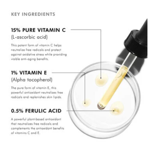 A patented daytime vitamin C serum for skin that improves the look of fine lines and wrinkles, loss of firmness, and brightening your skin's complexion. Now clinically proven to protect against environmental aggressors. C E Ferulic features a synergistic combination of 15% pure vitamin C (L-ascorbic acid), 1% vitamin E (alpha tocopherol), and 0.5% ferulic acid. C E Ferulic vitamin C serum improves the look of signs of aging. The benefits continue as this serum improves the look of fine lines and wrinkles, the loss of firmness all while brightening your skin's complexion.